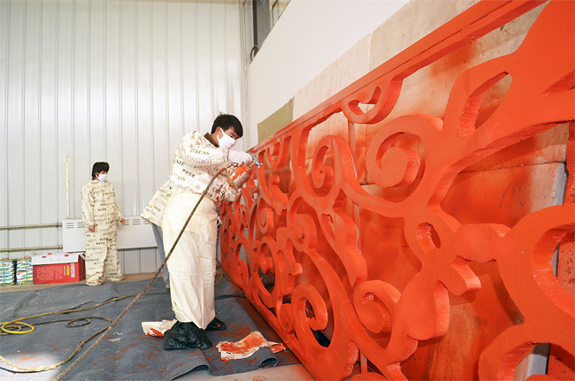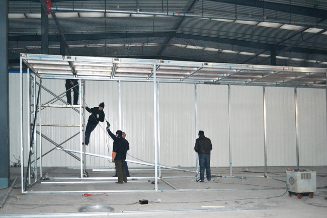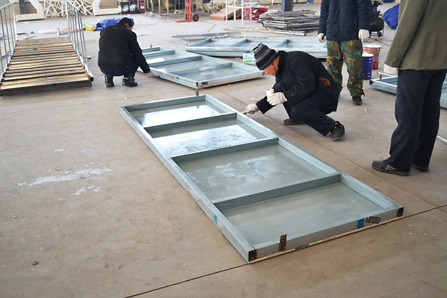 近日,中央電視臺《過年七天樂》節目錄制準備工作緊張有序的進行著。為減輕節目組的壓力,秦皇島康姿百德高新技術開發有限公司制造中心機修組主動承擔了舞臺背景的制作任務。 制造中心現場總指揮張振忠經理介紹:“舞臺背景氣勢宏偉,運用了燈籠、瓷器、木雕、中國結、山水畫、鏤空屏風、青磚墻等豐富的中國文化元素進行布局裝飾,工程量和工藝難度非產大。時間緊、任務重,要不打折扣的實現圖紙的設計風格,我們的壓力山大啊”。 1500平方米的制造車間內,機器轟鳴、電焊火花四濺,一派繁忙景象。工人們手持電焊機、切割機、雕刻機、角磨機、電鉆、手提鋸、曲線鋸、自制刀剪等十八般武器,各顯神通。從28日晚上8點接到任務到31日晚8點,制造中心的50多名工人每天都要忙碌到凌晨3點。 工作人員經過三天奮戰,于31日晚8點完成舞臺背景制作任務,并于當晚運到《過年七天樂》錄制現場組裝。