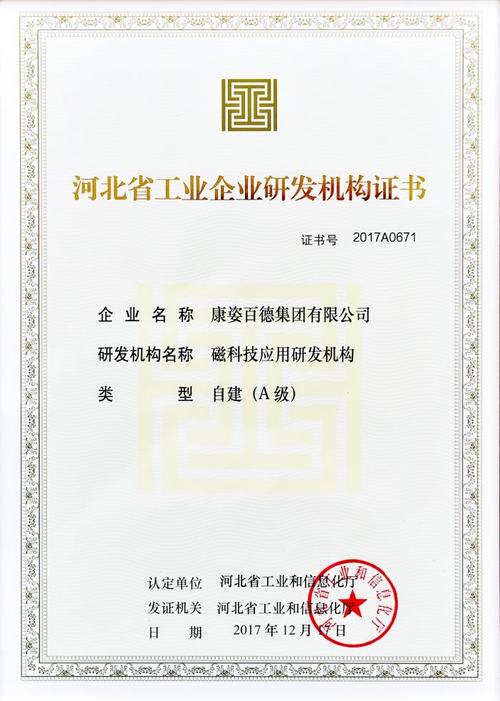日前,經河北省工業和信息化廳審定,康姿百德集團入選河北省工業企業研發機構名單,被認定為磁科技應用研發機構(A級)。