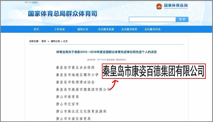 2017年,國家體育總局在全國范圍內評選“2013~2016年度全國群眾體育先進單位”,康姿百德集團入選。