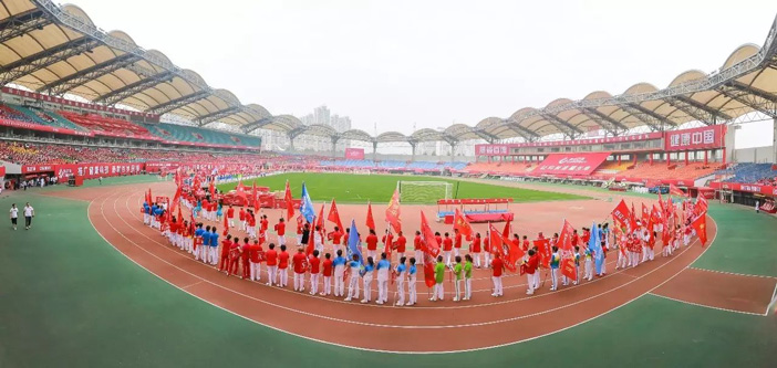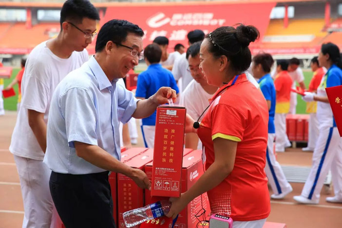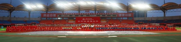 伴隨著優美激昂的《走向復興》音樂,一幅寫有“讓科技造福生命”、面積為608平方米的巨型紅旗步入賽場。康姿百德91名工作人員共舉旗幟,整齊自如地緩緩前行,給人以極大的視覺沖擊!