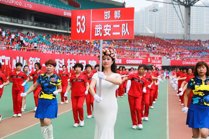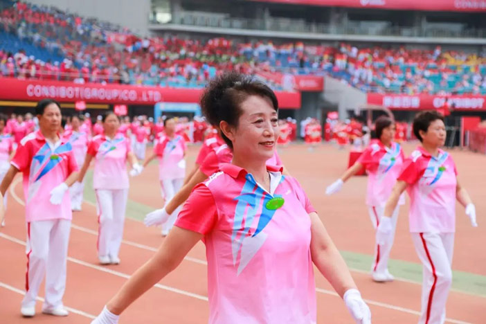 緊接著重頭戲來了~選手們踏著輕盈、整齊的步伐,伴著美妙的音樂,舞動起了康姿百德第六套健身操。整齊劃一的動作、矯健優美的姿態贏得了觀眾們的陣陣喝彩。
