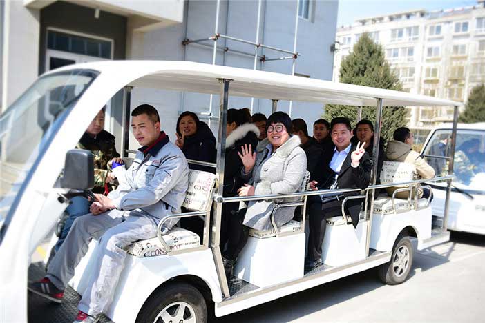 即將入職的區(qū)域經(jīng)理和店面經(jīng)理乘坐觀光車參觀康姿百德自動化生產(chǎn)線