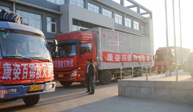 滿救災(zāi)物資的貨車離開康姿百德公司,駛向災(zāi)區(qū) “捎去我的愛心,帶上我的祝?!?/strong> “回饋社會,造福人類”,始終是康姿百德公司秉承的經(jīng)營理念。全國各地的康姿百德經(jīng)銷商在把幸福和健康帶給人們的同時,也深知自己身上的責(zé)任,不忘奉獻(xiàn)自己的愛心。他們積極捐款捐物,向災(zāi)區(qū)人民伸出援助之手。物資車途經(jīng)北京、河北、山西、河南等地時,當(dāng)?shù)亟?jīng)銷商囑咐司機一定把這份愛心物資安全送到災(zāi)區(qū), “捎去我的愛心,帶上我的祝?!保@是康姿百德人最強烈的心聲。