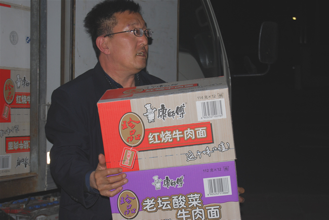 方便面、棉被、衣服等救災(zāi)物資載滿整個貨車