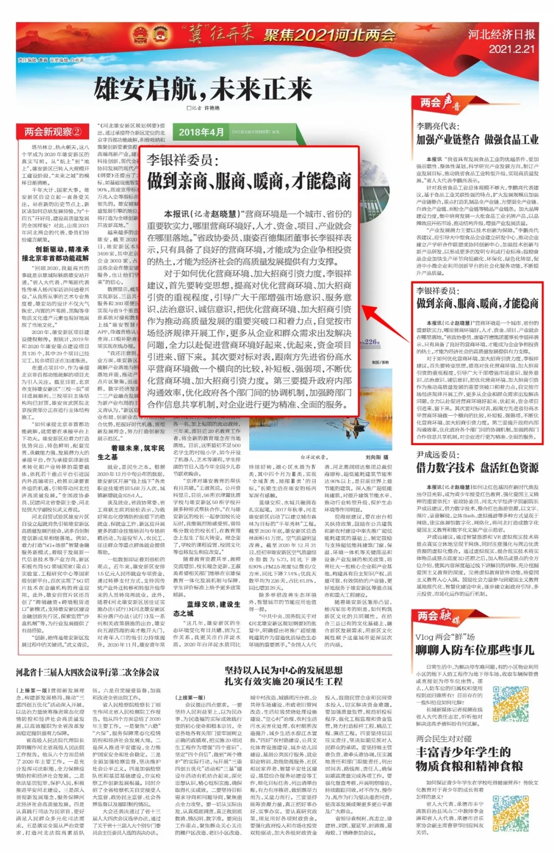 在河北省兩會政協委員駐地,李銀祥委員接受了河北經濟日報的專訪。在受訪的過程中,李銀祥董事長針對2021河北兩會如何優化營商環境的熱議話題,簡述了關于優化營商環境、加大招商引資力度的提案。李銀祥董事長的提案還被刊登在了2021年2月21日的河北經濟日報上。